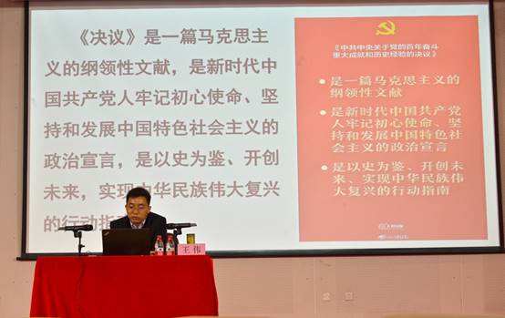 会上,王伟博士指出党的十九届六中全会深刻、系统地总结了我们党成立以来的重大成就和历史经验,深刻阐明了新时代确立习近平同志党中央的核心、全党的核心地位,确立习近平新时代中国特色社会主义思想的指导地位的决定性意义。“两个确立”的重大论断,是在把中国特色社会主义新时代的伟大成就放在党的百年奋斗历程中全面总结和科学判断的基础上作出的。他从“两个确立”提出的发展脉络、从百年党史看“两个确立”的决定性意义、从唯物史观和民主集中制原理理解确立核心、从科学社会主义原理理解确立新思想和把“两个确立”落实到“两个维护”实际行动上等五个方面,深刻阐述了“两个确立”的理论原理,并把其转化为党员思想自觉、政治自觉、行动自觉实际行动当中。
